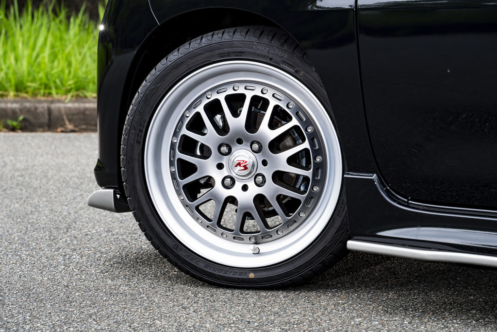 16インチと軽自動車の中では大径ホイールですが、少しクラシックでスポーティなデザインがマッチした仕上がりとなっています(*´ω`)
