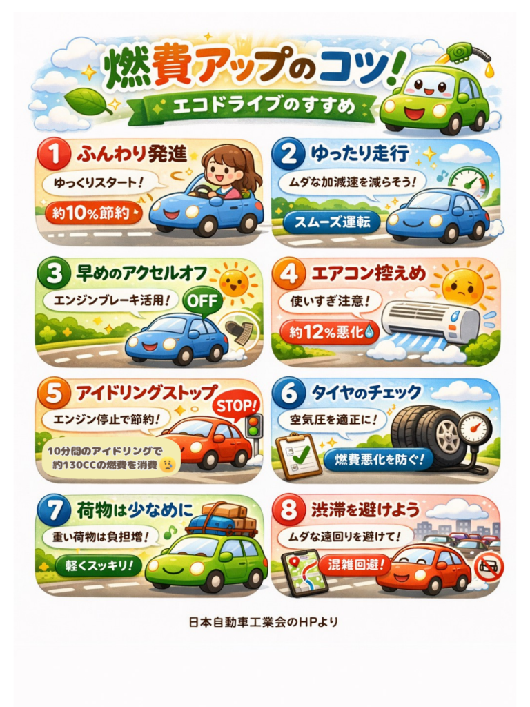 たとえば、ゆっくり発進する・ムダな加減速を減らす・アイドリングを控えるなど、すぐにできることばかり。