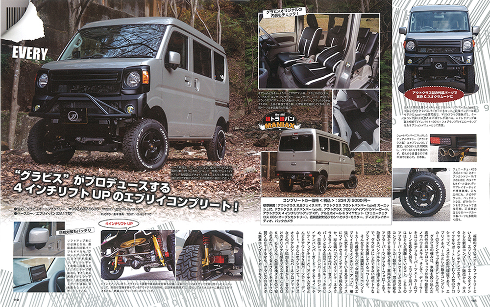 カスタムCAR 2026年2月号に掲載されました。 2025 12/26 カスタムCAR 2025年12月26日 カスタムCAR 2026年2月号 軽トラ軽バン MANIAX にグラビスオートファクトリーのデモカー エブリイ丸目4インチリフトアップコンプリートが掲載されました。p118〜P119 掲載車種へGo! 本誌「カスタムCAR 2026年2月号」は芸文社オンラインストアで発売中です。 カスタムCAR よかったらシェアしてください! URLをコピーしました! KCARスペシャル Vol.43 スズキ エブリイ No.16に掲載されました。